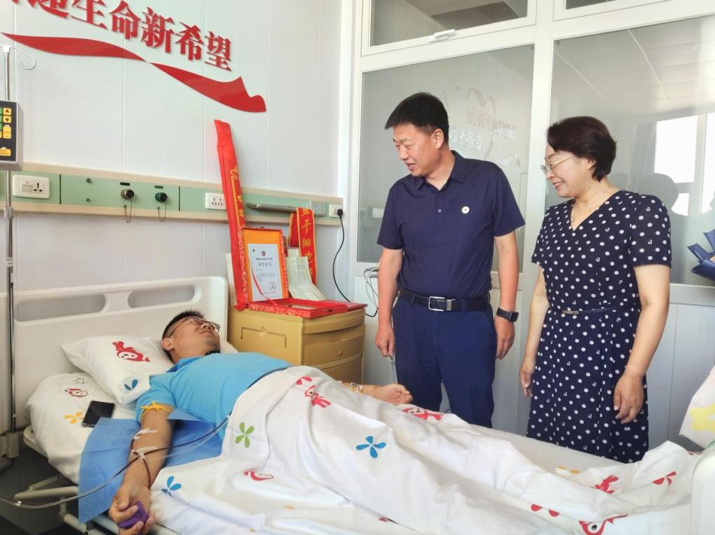 从本科到博士,从医学生到医生,20余载从医路,让这位如今已到“四十不惑”的医生,对生命有着更为深刻的感悟,他以一名造血干细胞捐献者的身份,为一位18岁的白血病患者送去了重生的希望,用实际行动诠释了医者的担当与大爱。“当代雷锋”郭明义送上爱心祝福。大连市红十字会党组书记、专职副会长万鹏飞,学校党委常委、副校长杨晓丽及附属第一医院、研究生院、团委的领导和老师前去看望,并送上了学校自主研发的饮品“金黄饮”。