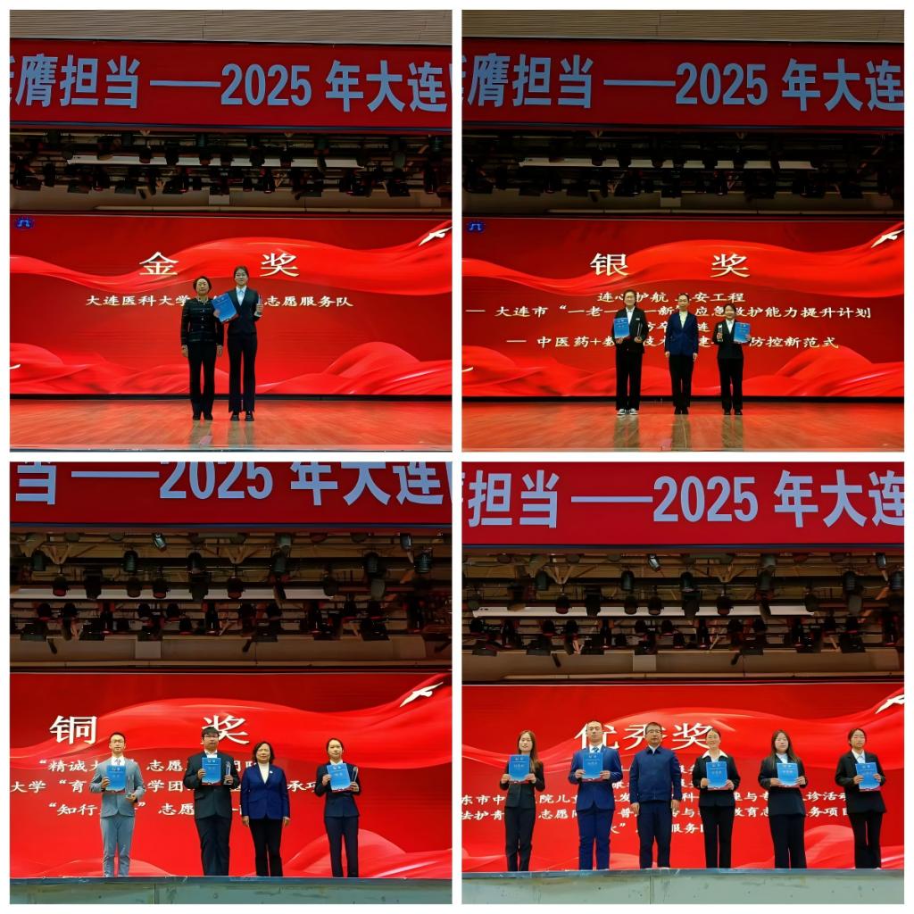 杨晓丽等与会领导为大连医科大学首届志愿者项目大赛获奖项目颁奖。